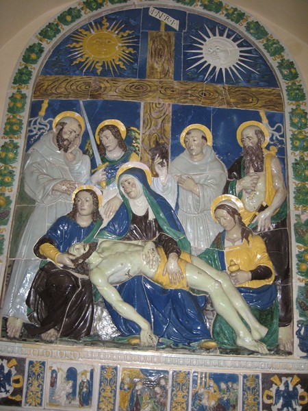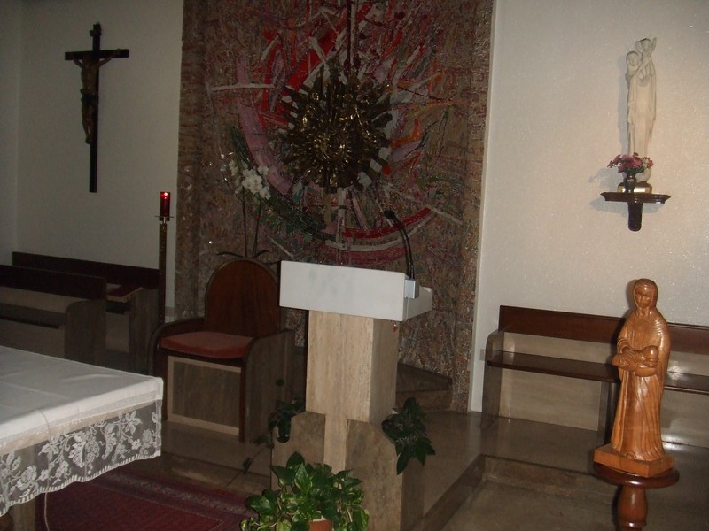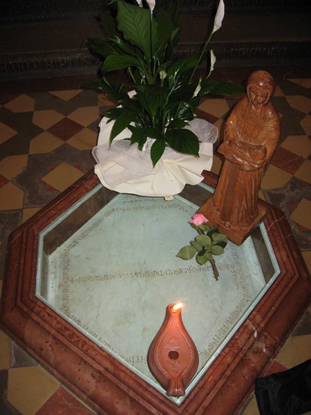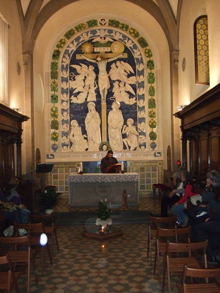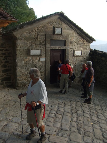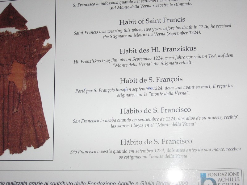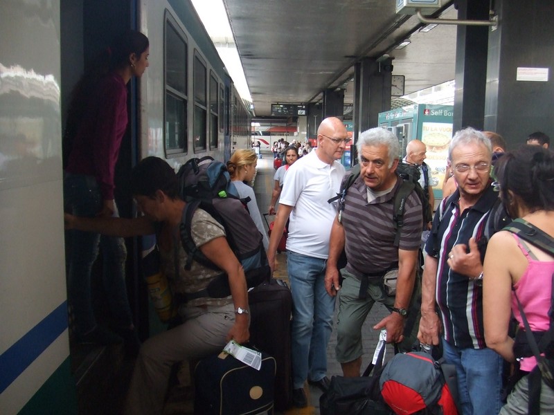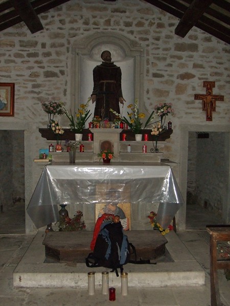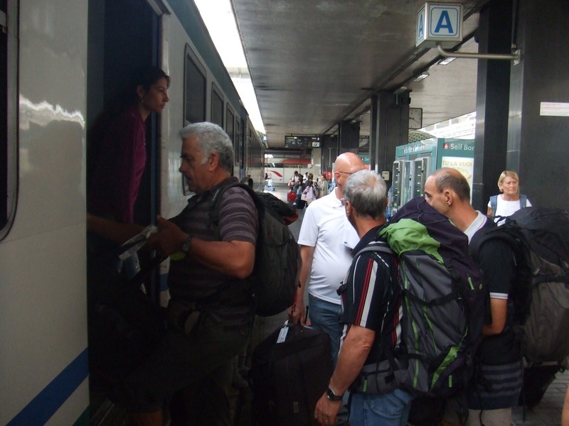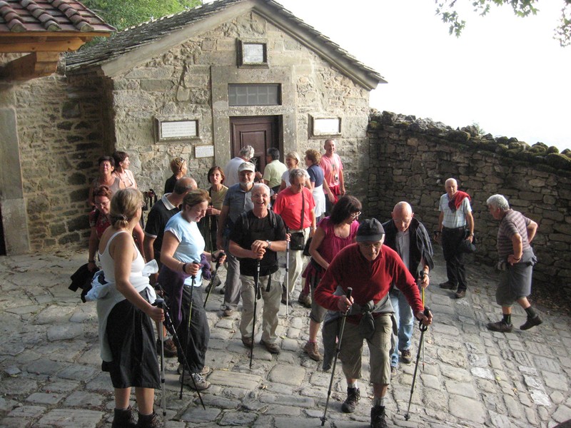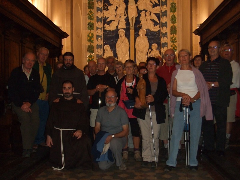 Pour les français, suite du voyage en train jusqu'à Bibbiena où nous retrouvons dans une belle ambiance, nos 4 amis italiens : Le groupe composait maintenant de 26 personnes s’installe chez les soeurs de St Vinent de Paul à Chiusi della Verna, au pied du sanctuaire de La Verna, en Toscane. C'est à ce sanctuaire que venait très souvent St François d'Assise: C'est aussi le point de départ de notre pèlerinage à pied jusqu'à Assise. Nous montons à pied jusqu'au sanctuaire : une bonne mise en jambes : ça grimpe ! Nous assistons à la messe de 18 h dans la chapelle des stigmates de St François où notre Vierge Pèlerine occupe une place d'honneur. Puis, c’est la photo de famille avec les frères franciscains.