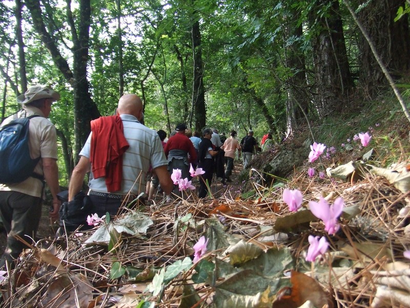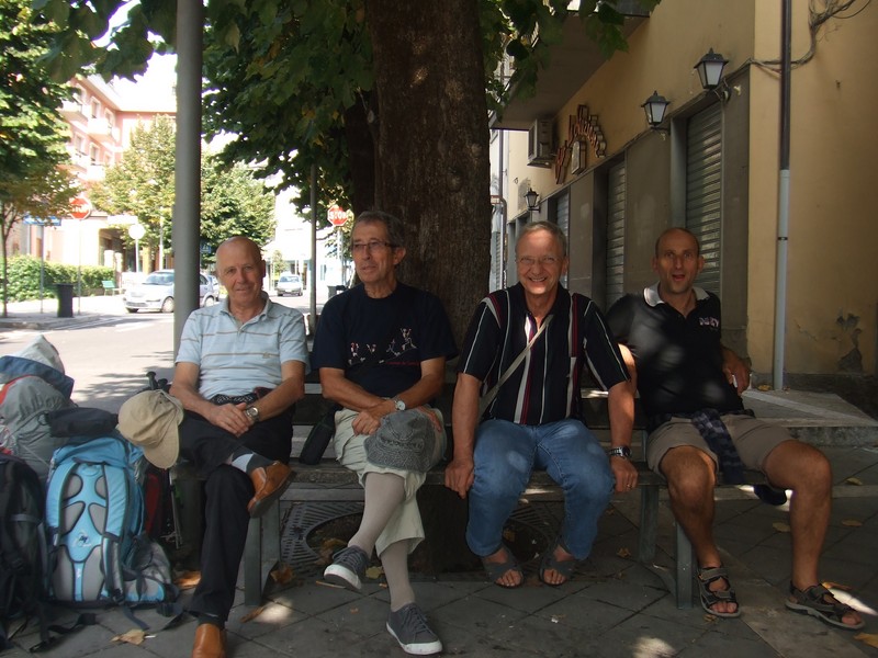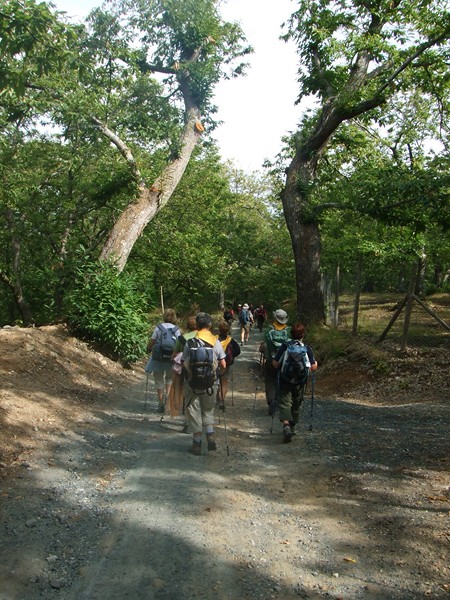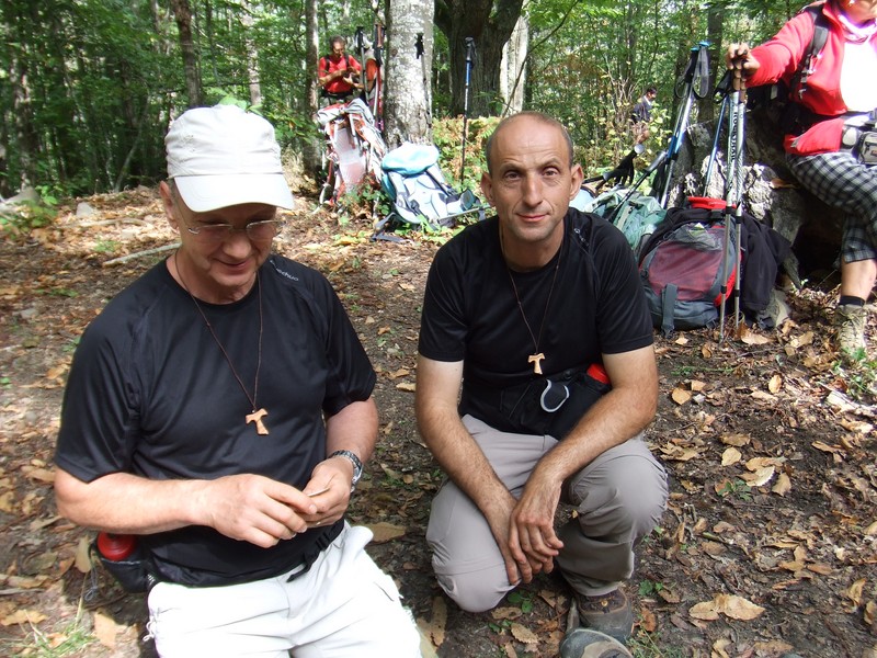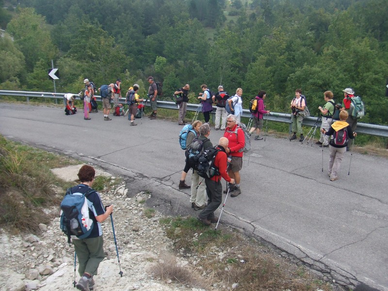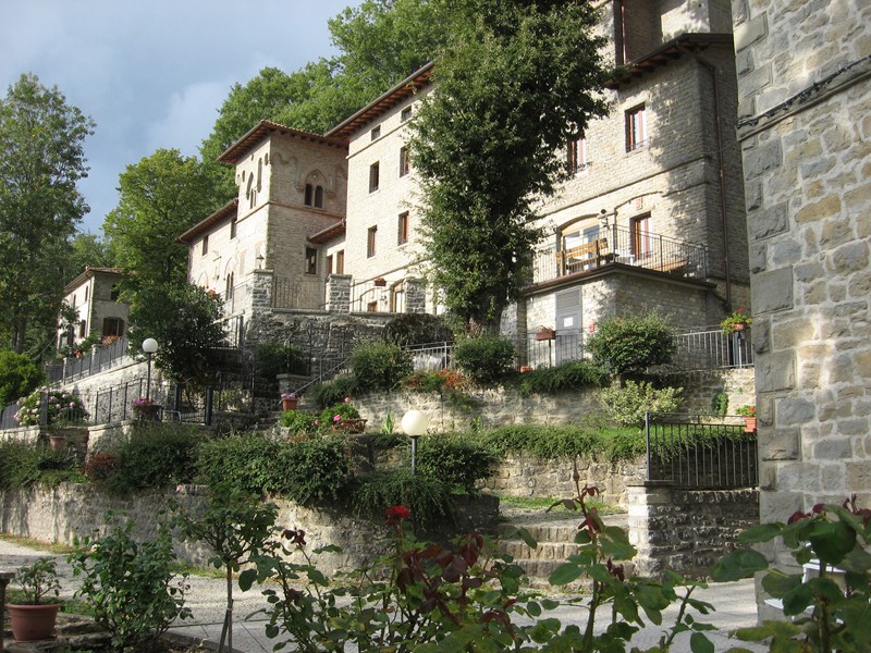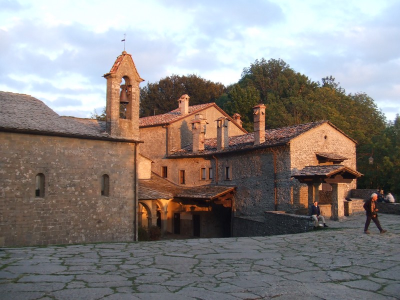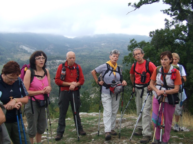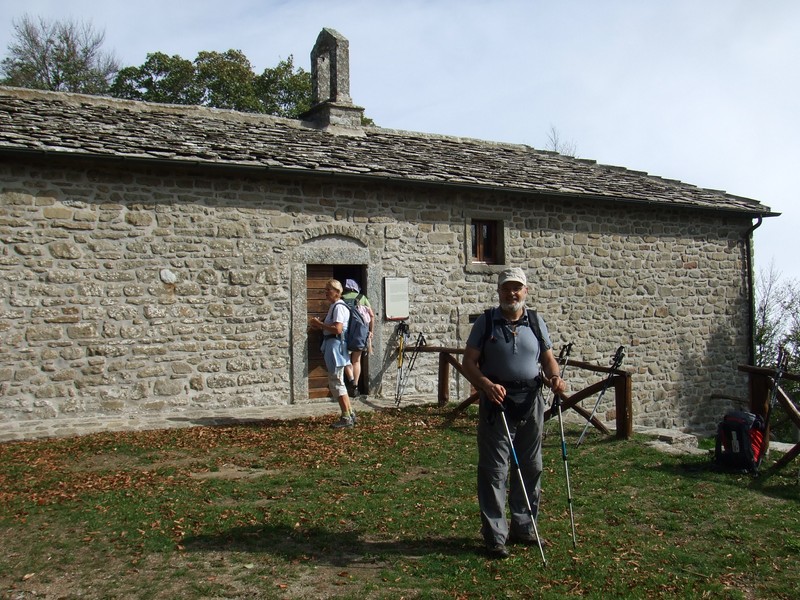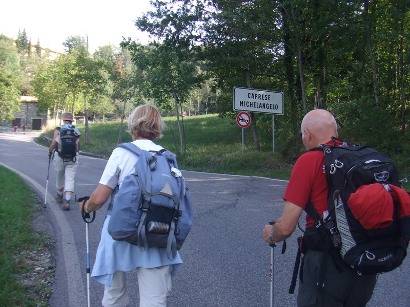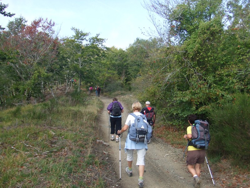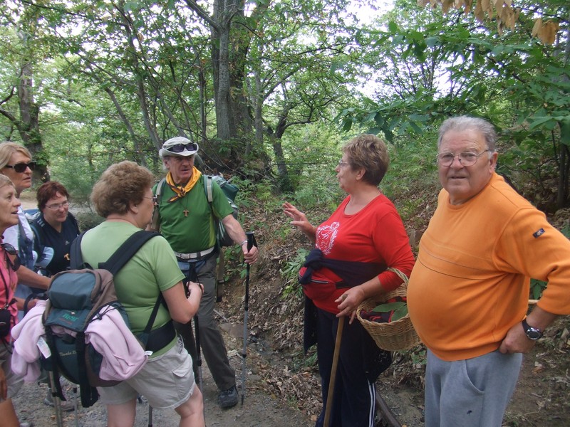 Première étape : La Verna - Caprese Michelangelo Le premier jour, c’est une mise en bouche de 20 kms. Etape facile, peut-on penser ? Pas du tout ! . En quittant à 8 h, Chiusi della Verna, c’est d’abord 3 kilomètres de descente qui nous permettent de passer tout près de la maison natale de Michel-Ange. Puis, les choses sérieuses commencent avec une montée à gros pourcentage. A 9 h, c'est l'heure de la priere, en union avec tous ceux qui pensent à nous, et notamment le Père Jean à Montfranc. Le temps est couvert mais il ne pleut pas. Idéal pour la rando. Au loin, Bruno nous fait remarquer une montagne qui a servi de modèle pour une des célèbres œuvres de Michel-Ange. Notre ascension continue pour atteindre le « sommet du chemin d’Assise », à 1 263 m d’altitude. Là, se trouve l’ermitage de Casela où St François passa à son dernier retour d’Assise en 1224. Après quelques instants de repos et après avoir lu la prière de St François, notre groupe reprend un sentier de crête avant de descendre progressivement. Après la pause de midi, dans les sous-bois, nous rencontrons des chercheurs de champignons: Ils ont des cèpes...et aussi d'autres qualités que nous n'avons pas l'habitude de cueillir…et de manger. Apres une longue et agréable descente jusqu’à Lama, nous remontons sur 1, 7 kms pour arriver avant 16 h à l’hébergement de Caprese Michelangelo.