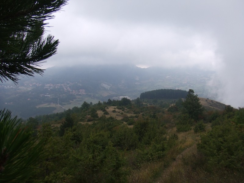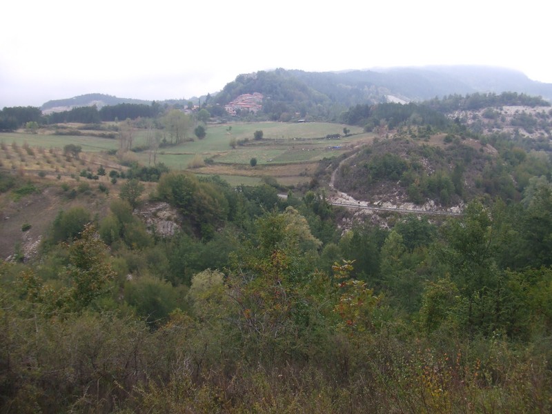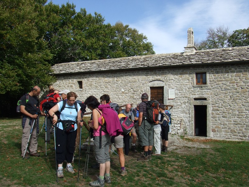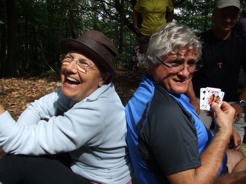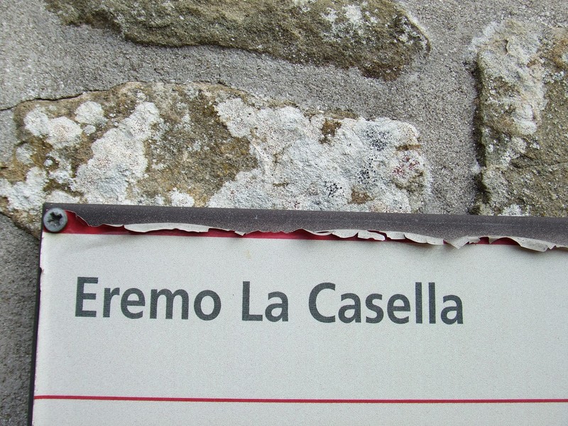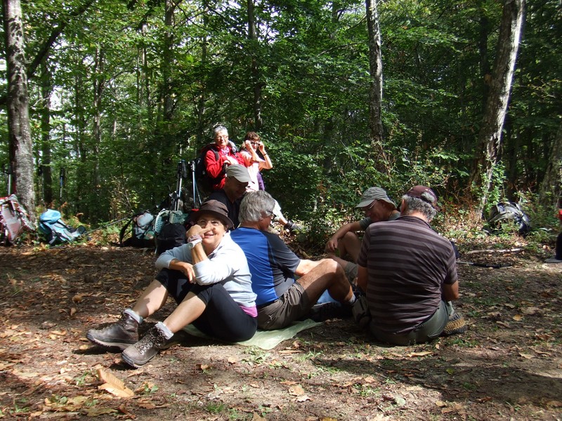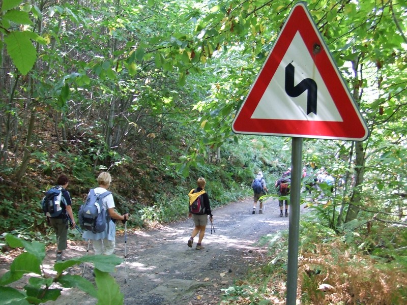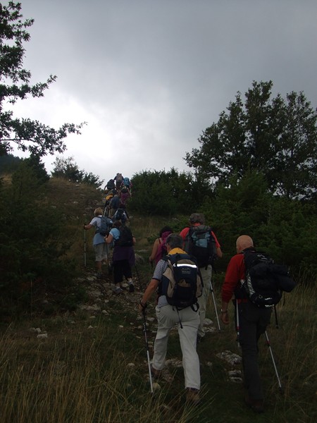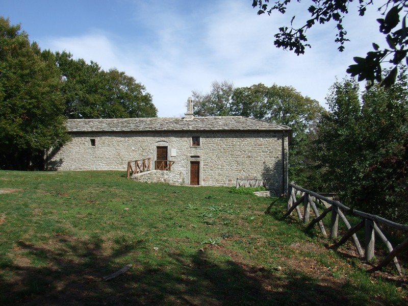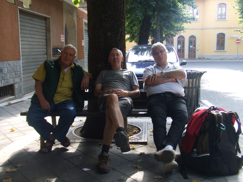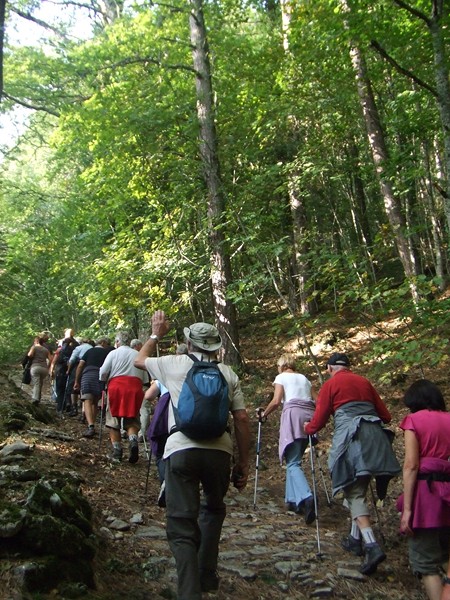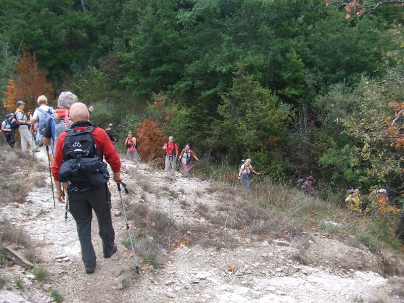 Première étape : La Verna - Caprese Michelangelo Le premier jour, c’est une mise en bouche de 20 kms. Etape facile, peut-on penser ? Pas du tout ! . En quittant à 8 h, Chiusi della Verna, c’est d’abord 3 kilomètres de descente qui nous permettent de passer tout près de la maison natale de Michel-Ange. Puis, les choses sérieuses commencent avec une montée à gros pourcentage. A 9 h, c'est l'heure de la priere, en union avec tous ceux qui pensent à nous, et notamment le Père Jean à Montfranc. Le temps est couvert mais il ne pleut pas. Idéal pour la rando. Au loin, Bruno nous fait remarquer une montagne qui a servi de modèle pour une des célèbres œuvres de Michel-Ange. Notre ascension continue pour atteindre le « sommet du chemin d’Assise », à 1 263 m d’altitude. Là, se trouve l’ermitage de Casela où St François passa à son dernier retour d’Assise en 1224. Après quelques instants de repos et après avoir lu la prière de St François, notre groupe reprend un sentier de crête avant de descendre progressivement. Après la pause de midi, dans les sous-bois, nous rencontrons des chercheurs de champignons: Ils ont des cèpes...et aussi d'autres qualités que nous n'avons pas l'habitude de cueillir…et de manger. Apres une longue et agréable descente jusqu’à Lama, nous remontons sur 1, 7 kms pour arriver avant 16 h à l’hébergement de Caprese Michelangelo.