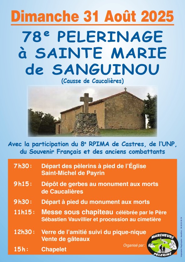 Cette année encore, le traditionnel pèlerinage à Sainte Marie de SANGUINOU, a connu un vrai succès. On estime à environ 300 personnes le nombre de participants venus à pied, en vélo ou en voiture. Avec un temps idéal pour marcher, 25 pèlerins partent à 7 h 30 de l’église Saint Michel de PAYRIN.