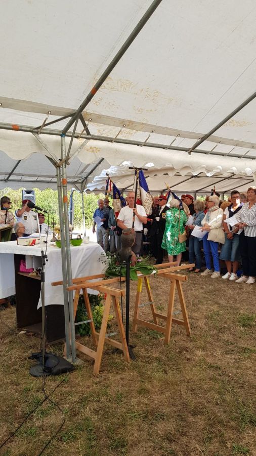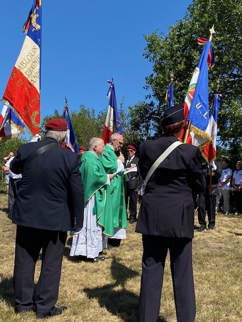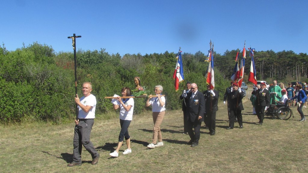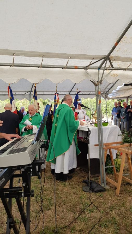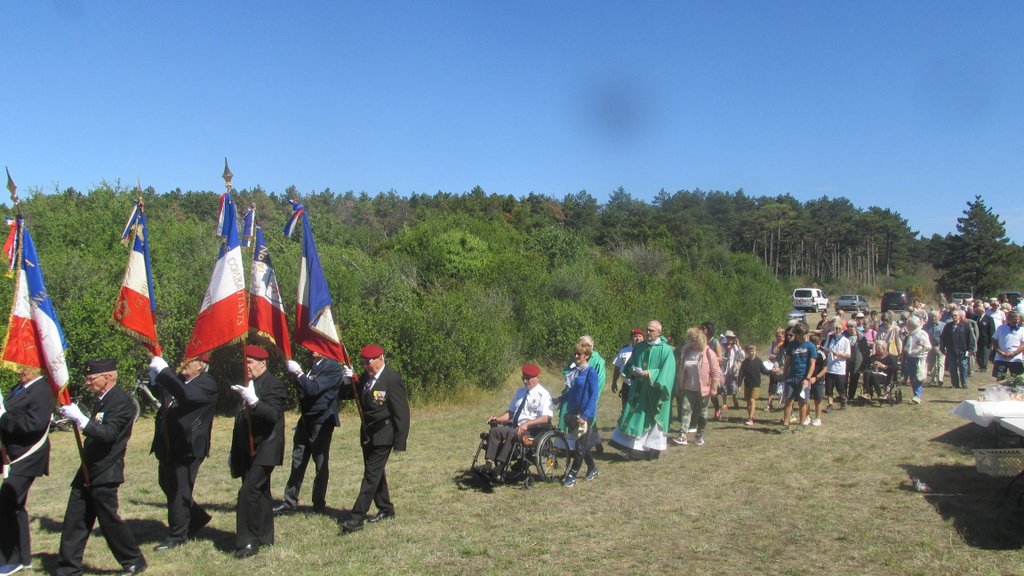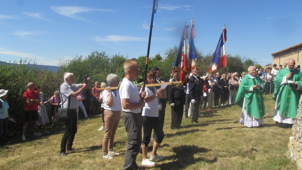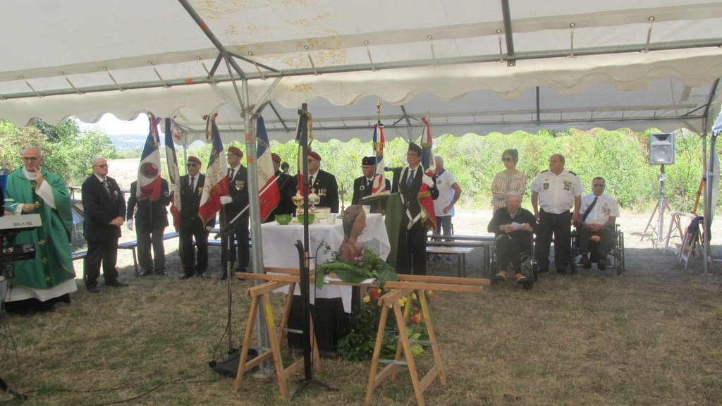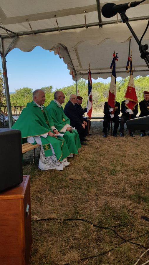 Les pèlerins à pied reprennent le chemin vers SANGUINOU. Cette fois, le groupe s’est étoffé et une bonne quarantaine arrive à la chapelle vers 11 h. Un quart d’heure plus tard, avec les Pères Sébastien VAUVILLIER, curé de REVEL et Laurent PISTRE, curé de la paroisse du Christ Roi de MAZAMET, les porte-drapeaux et les représentants des différentes associations d’anciens combattants la messe peut commencer. La foule rassemblée sous les 4 chapiteaux reste recueillie, attentive à l’homélie du Père Sébastien qui salue, entre autres, le fait que ce pèlerinage non seulement perdure mais aussi grandisse au fil des ans. Les chants sont repris avec ferveur par une assemblée qui ne se laisse pas perturber par le vent d’Autan qui souffle de plus en plus fort sur le Causse.