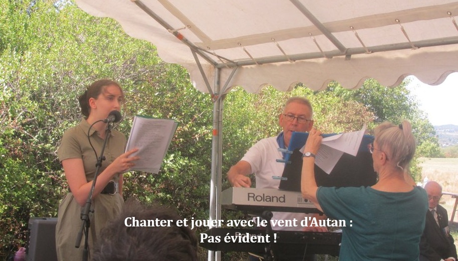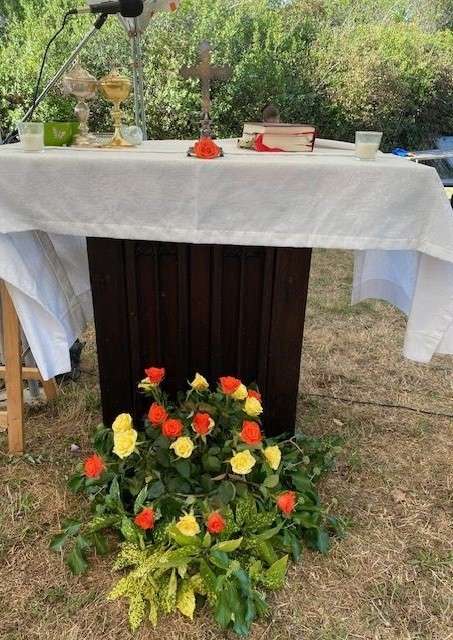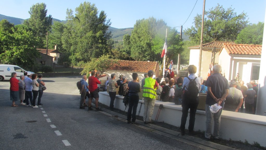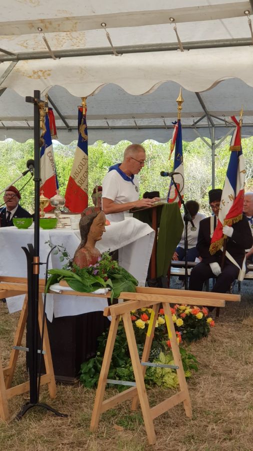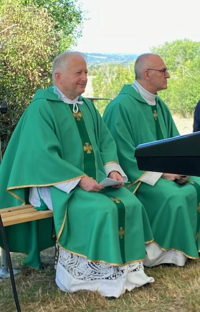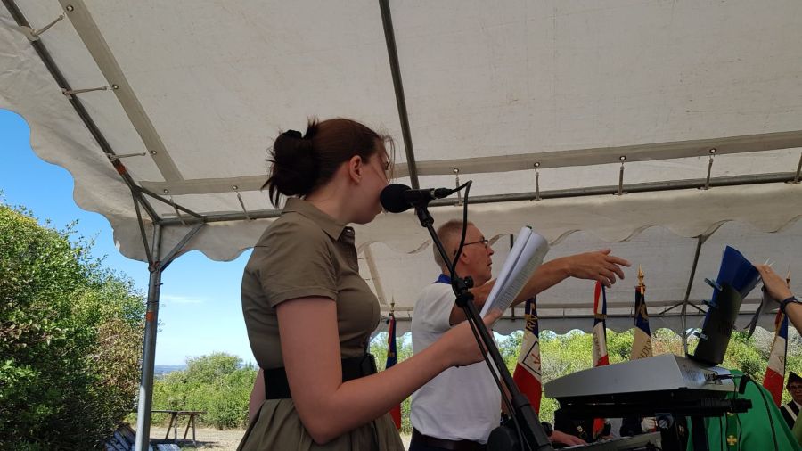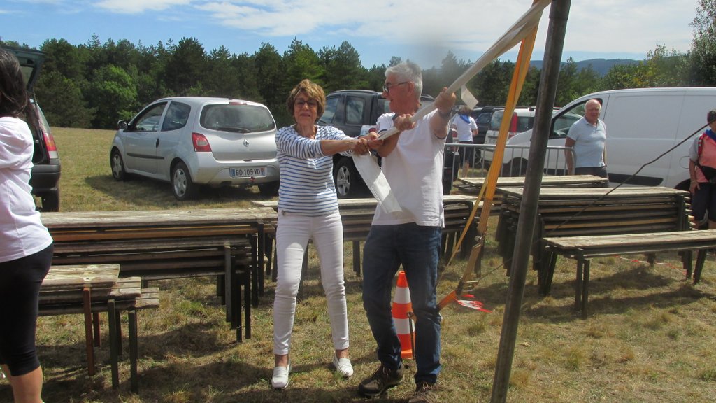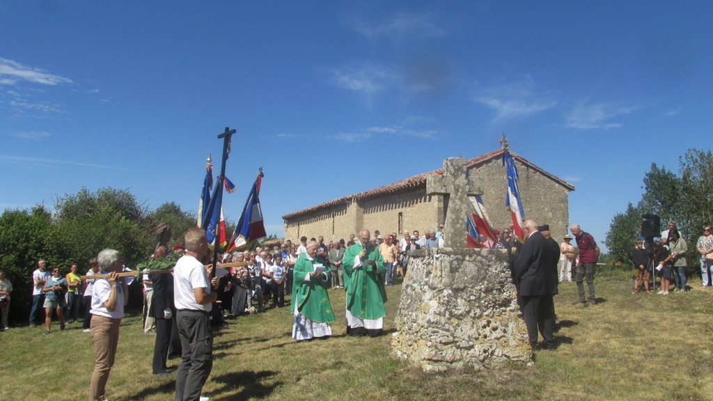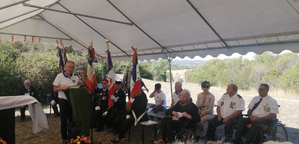 Les pèlerins à pied reprennent le chemin vers SANGUINOU. Cette fois, le groupe s’est étoffé et une bonne quarantaine arrive à la chapelle vers 11 h. Un quart d’heure plus tard, avec les Pères Sébastien VAUVILLIER, curé de REVEL et Laurent PISTRE, curé de la paroisse du Christ Roi de MAZAMET, les porte-drapeaux et les représentants des différentes associations d’anciens combattants la messe peut commencer. La foule rassemblée sous les 4 chapiteaux reste recueillie, attentive à l’homélie du Père Sébastien qui salue, entre autres, le fait que ce pèlerinage non seulement perdure mais aussi grandisse au fil des ans. Les chants sont repris avec ferveur par une assemblée qui ne se laisse pas perturber par le vent d’Autan qui souffle de plus en plus fort sur le Causse.