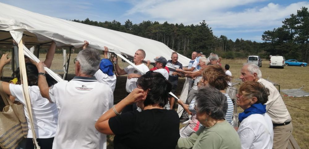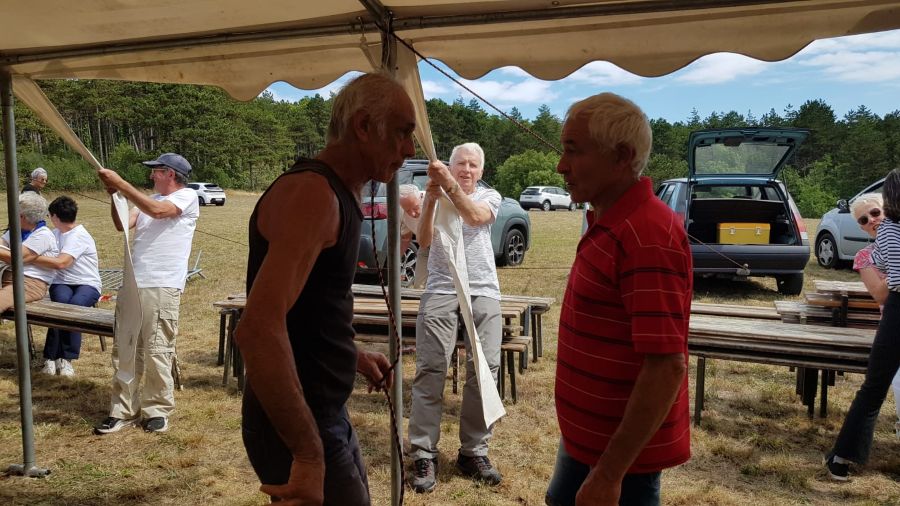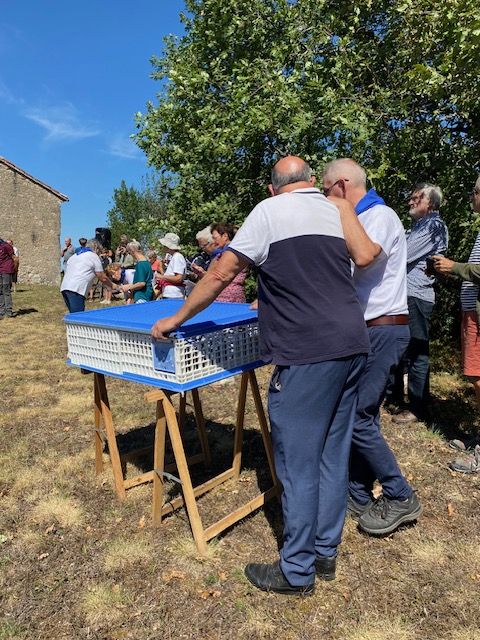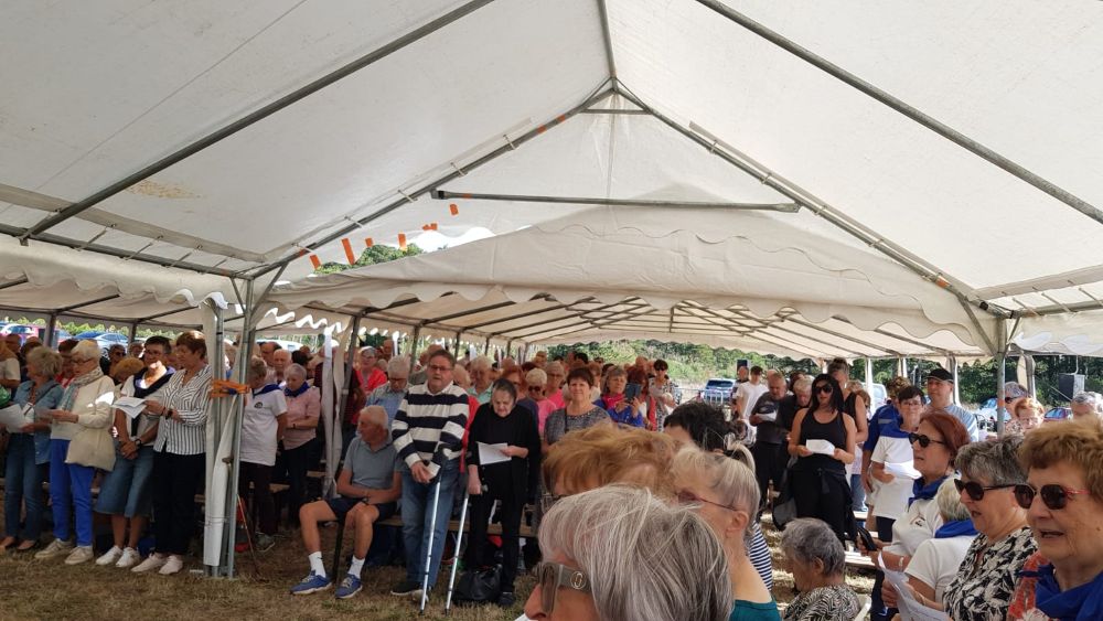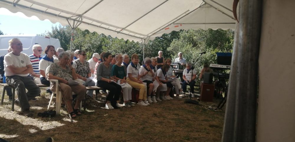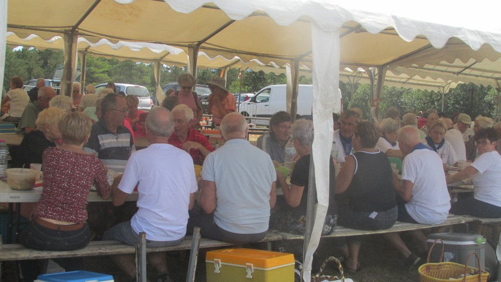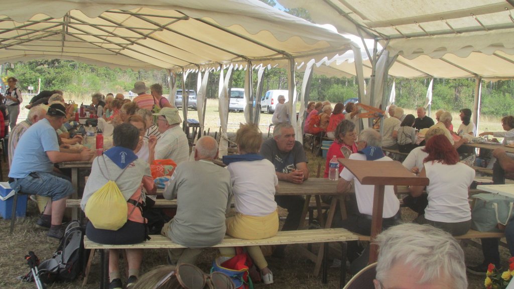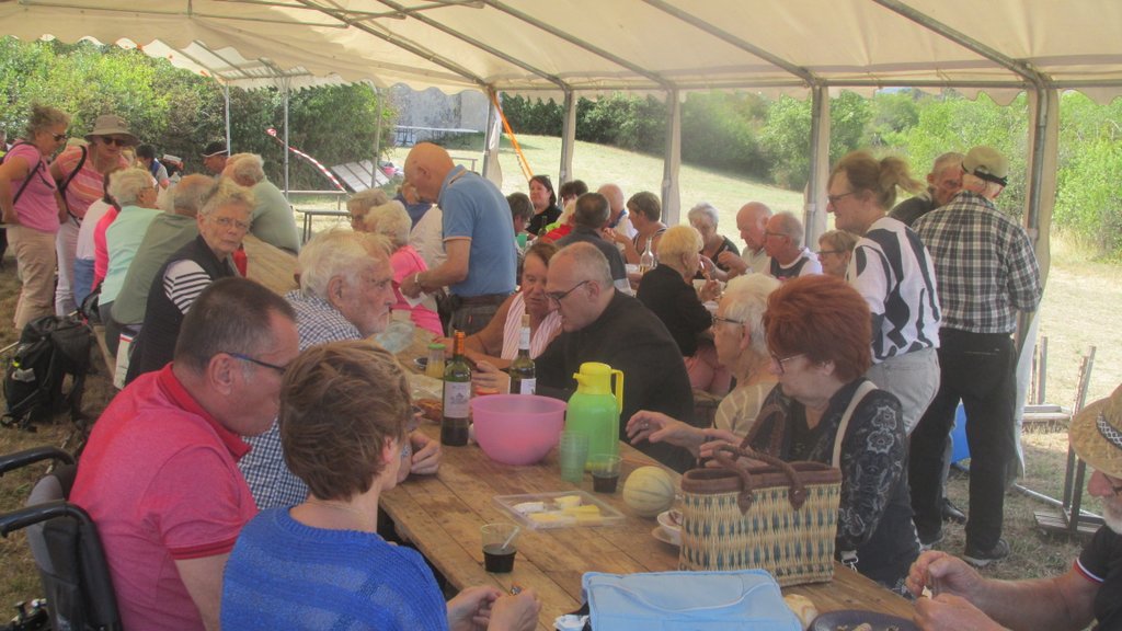 Vers 12 h 30 – 12 h 45, toutes les personnes présentes sont invitées au verre de l’amitié offert par « Marcheurs et Pèlerins ». Puis, plus de 150 convives prennent place sous les chapiteaux pour le grand pique-nique.