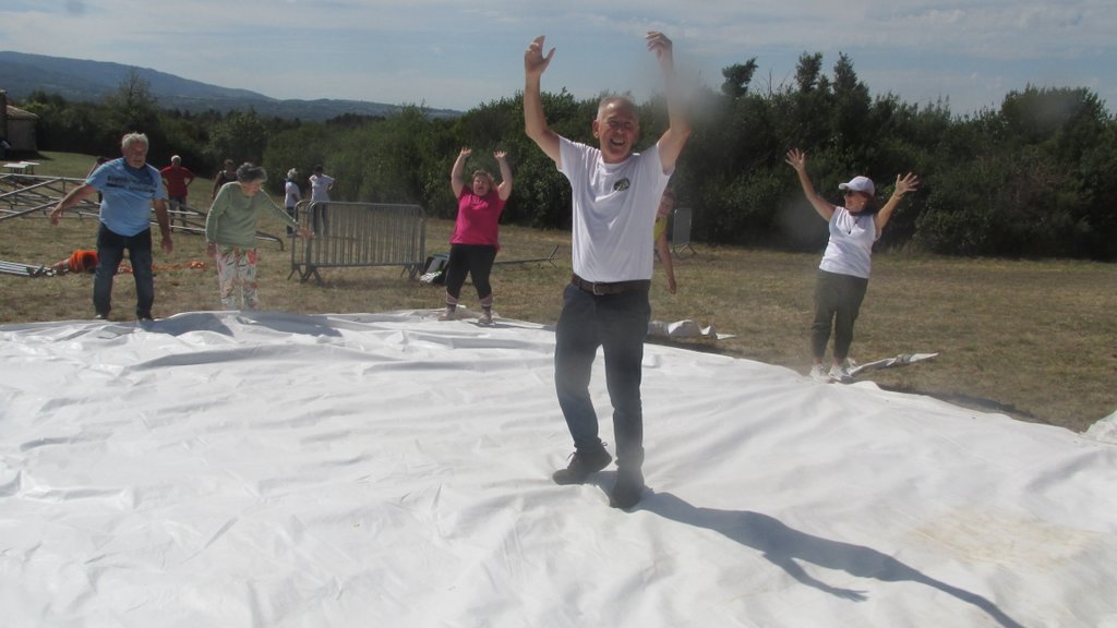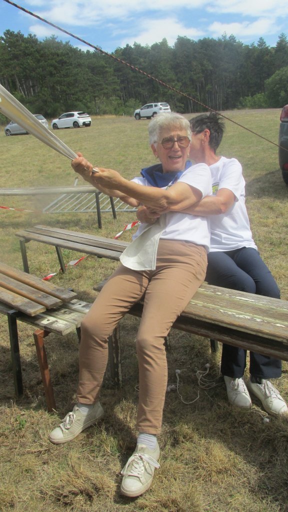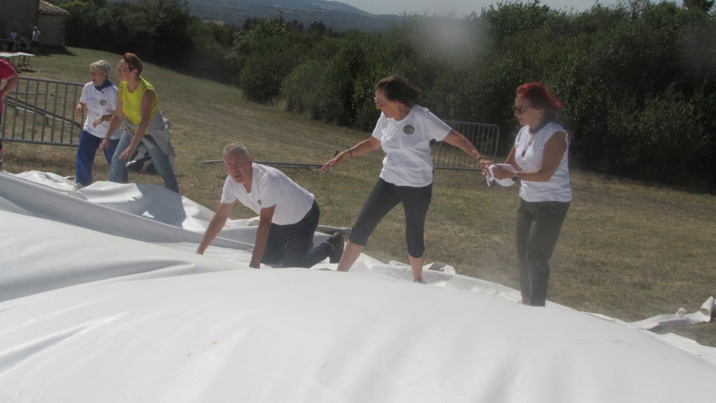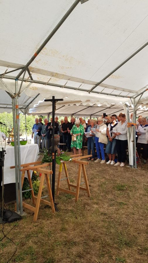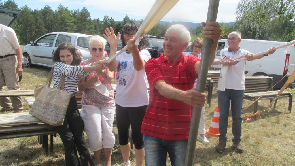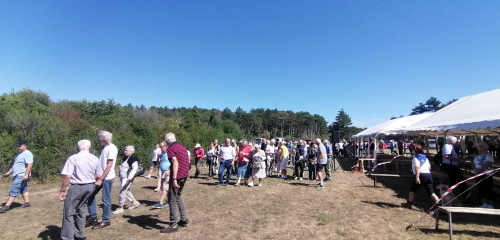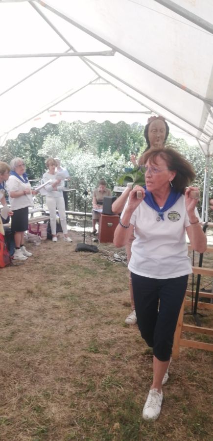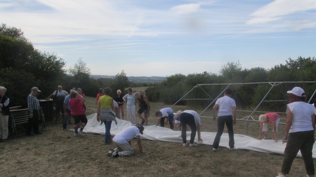 Vers 12 h 30 – 12 h 45, toutes les personnes présentes sont invitées au verre de l’amitié offert par « Marcheurs et Pèlerins ». Puis, plus de 150 convives prennent place sous les chapiteaux pour le grand pique-nique.