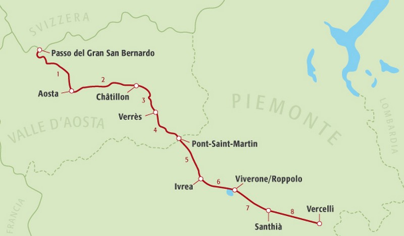 Au programme: 6 jours de marche (135 kms) en faisant étape à Aoste, Chatillon, Verres, Pont St Martin, Ivrea et Viverone.